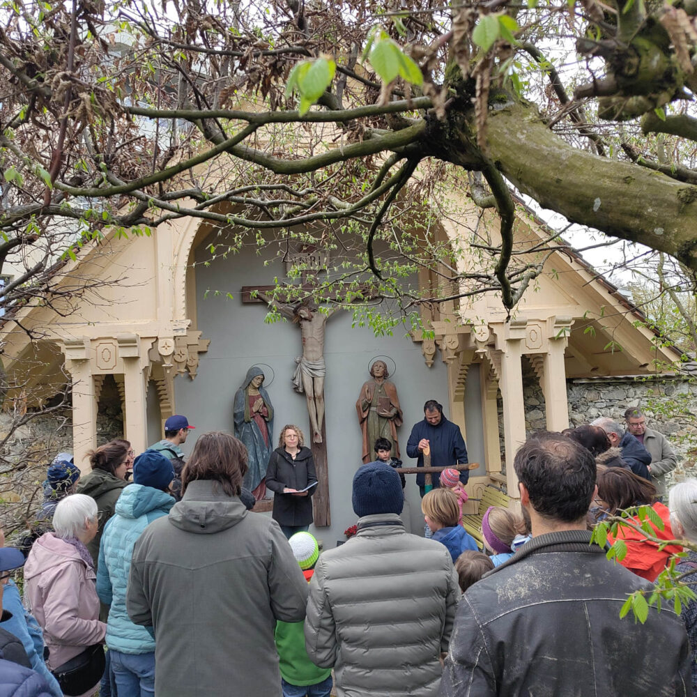 Auch wenn der traditionelle Kreuzweg 14 Stationen umfasst, besteht dieser Kreuzweg aus sechs, höchstens sieben Stationen. Nach dem Hören eines Bibeltextes machen sich die Teilnehmenden gemeinsam auf den Weg. Dieser ist bewusst gewählt: Die Stationen verankern den Kreuzweg in der Umgebung und stellen einen Bezug zum gesellschaftlichen Kontext her. «Wenn es um die Verurteilung Jesu geht, dann stehen wir zum Beispiel vor dem Pranger beim Rathaus. Es ist nicht nur ein individueller Weg, den Jesus ging, sondern auch eine Auseinandersetzung mit der Umwelt», erklärt Giuseppe Corbino. Dem Vorbereitungsteam ist wichtig, dass sich Bezüge zum heutigen Leben herstellen lassen. «Das», so meint Giuseppe Corbino, «ist besonders für Kinder wichtig.» Die Station mit Simon von Cyrene, der Jesus hilft, ist für sie gut nachvollziehbar. Ergänzend dazu gibt es besonders für die Kinder gestalterische Elemente. Vielleicht ist es gerade diese schlichte Form des Unterwegsseins, die erklärt, warum sich Kinder und Erwachsene immer wieder neu darauf einlassen.